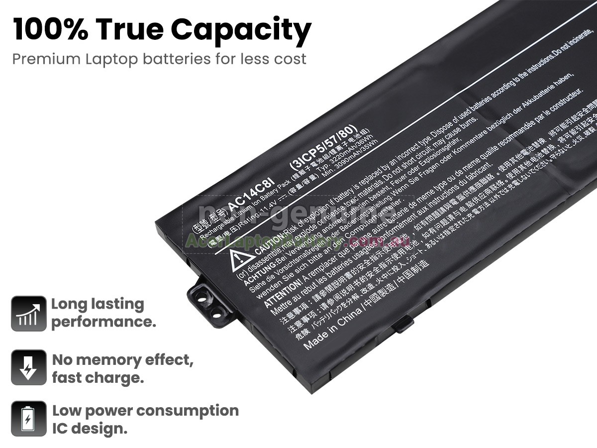Our brand new replacement battery for the Acer AC14C8I(3ICP5/57/80) notebook is made with high-grade cells from Samsung, LG, and Panasonic for maximum performance. This replacement Acer AC14C8I(3ICP5/57/80) battery pack is specially designed with multiple-protection circuits for maximum safety. The housing(case) of the Acer AC14C8I(3ICP5/57/80) battery pack is made of non-flammable and very durable plastic, which is fire retarded and avoids damage when dropped from low heights